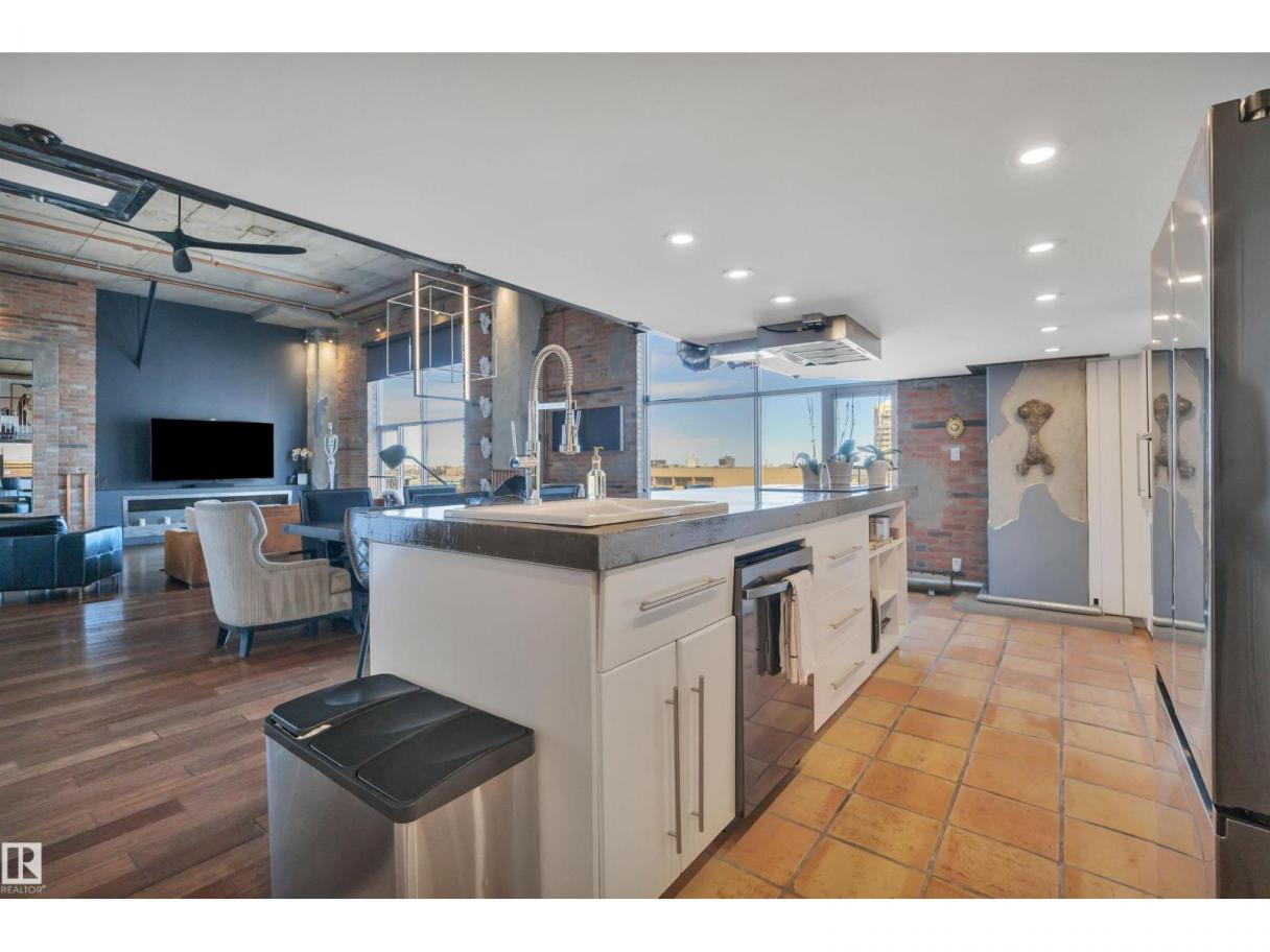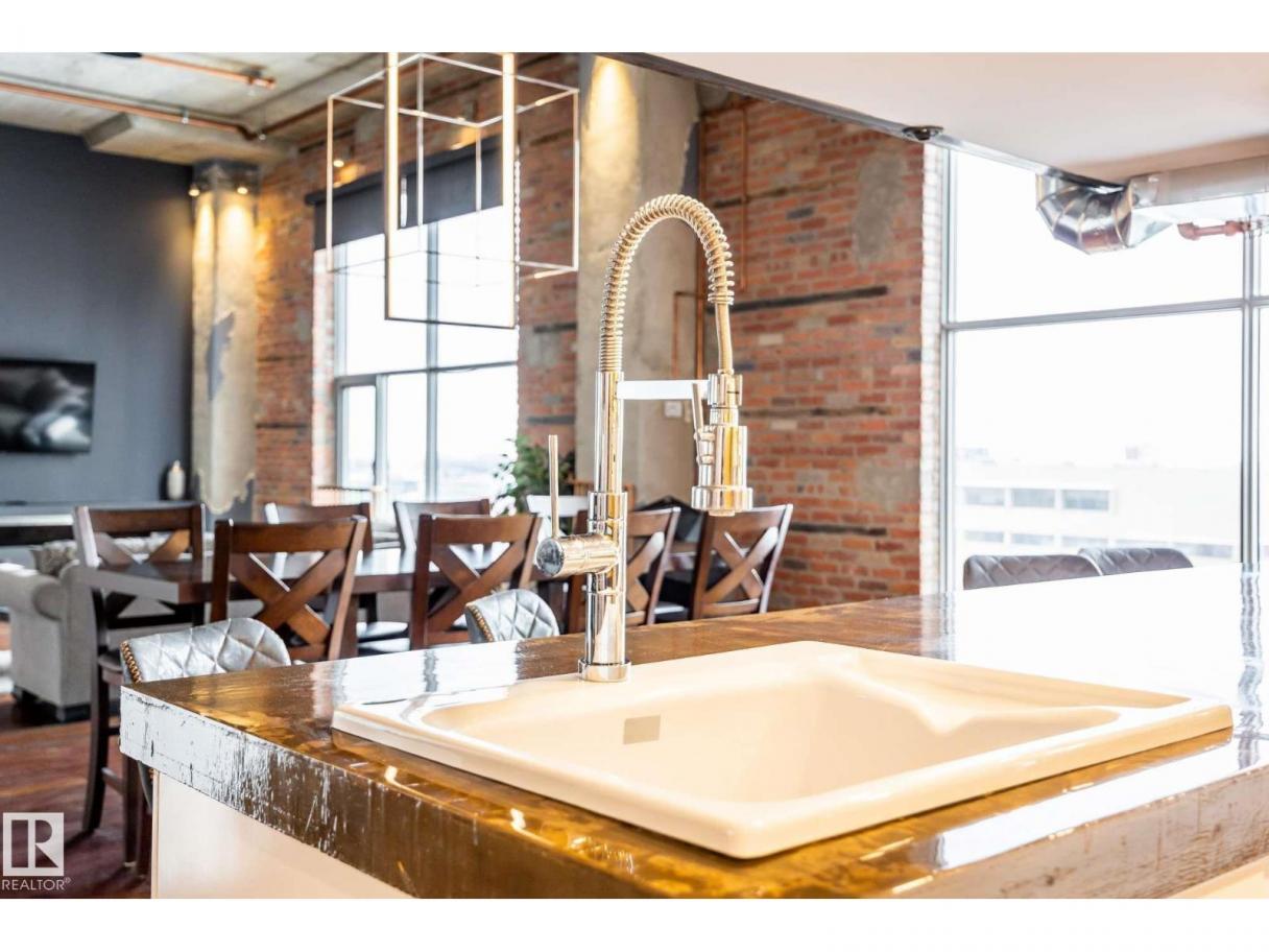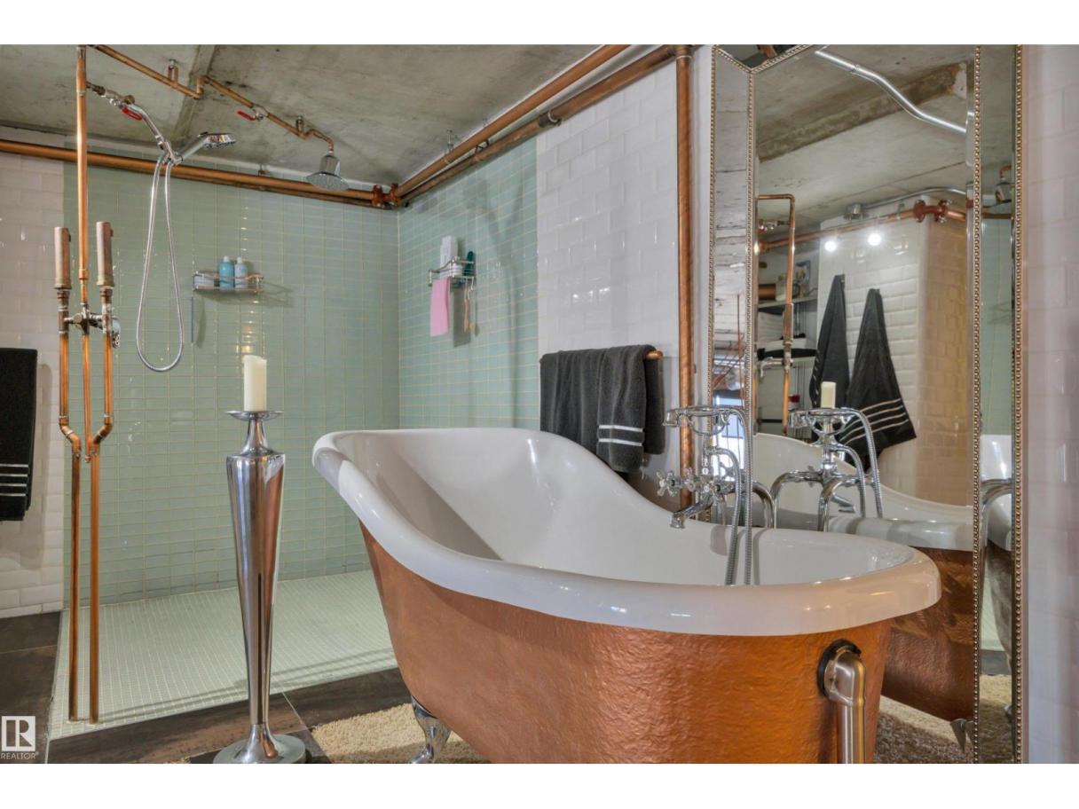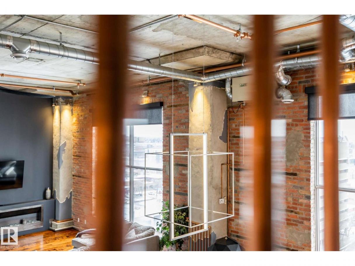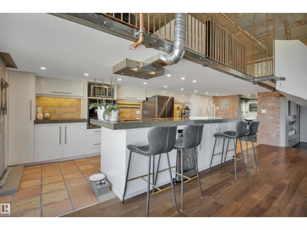 You won’t believe the WOW FACTOR in this NY-style urban penthouse loft in Edmonton’s trendy Downtown Warehouse District. One of only four penthouses, this stunning home offers over 2,000 sq ft of open-concept living with soaring 13’ ceilings, floor-to-ceiling windows, and striking mirrored accents. The main level features a spacious living area with exposed brick and concrete, a dining space, dream kitchen, den, 4-piece bath, and a laundry room with storage. A dramatic curved copper staircase leads to the mezzanine, complete with two generous bedrooms, a 5-piece ensuite, and a two-person sauna. Recent upgrades include Hunter Douglas remote-controlled blinds, statement lighting, new stove, washer & dryer. This 2 bed, 2 bath unit includes three underground parking stalls (1 single, 1 tandem) and a storage unit. Steps to the Ice District, restaurants, cafes, shopping, dog park, transit, and Grant MacEwan University. (id:6769)