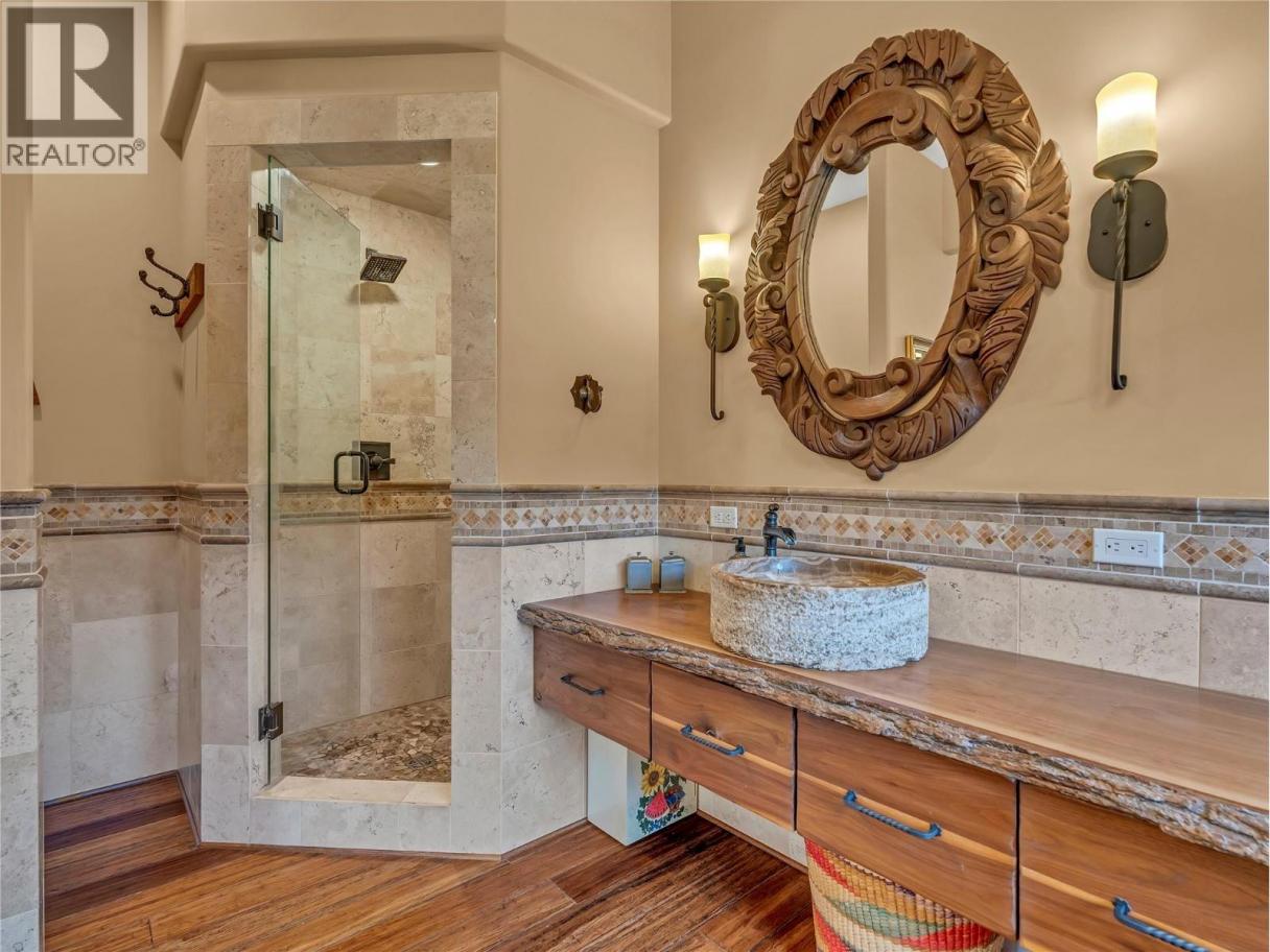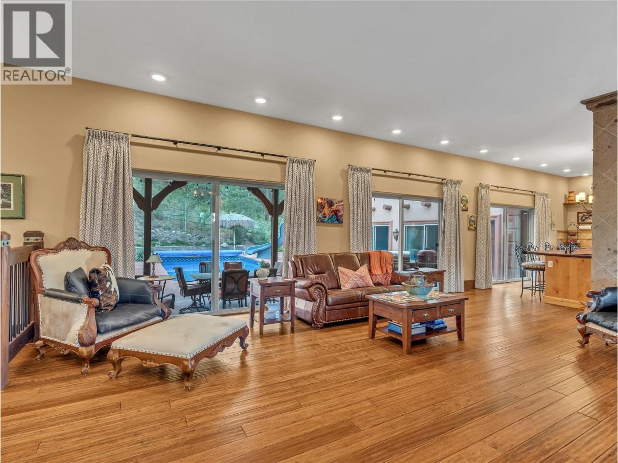 Ten acres in the heart of South Okanagan wine country - a property that genuinely earns the word estate. The custom Santa Fe-inspired home spans 3,300 sq ft across two levels, with 3 bedrooms, 3 bathrooms, and details you don't come across often - imported Mexican tile, bamboo flooring, 10' ceilings, and a chef's kitchen anchored by a striking Bubinga wood island sourced from South Africa. Granite counters, premium appliances, and a stained-glass walk-in pantry complete the space. A stone fireplace commands the main living area, and the primary suite delivers with a clawfoot tub and steam shower ensuite. An oversized double garage and powder room complete the main level. Outside, the property shifts gears. Saltwater pool with a covered outdoor kitchen with reclaimed timber beams and granite counters, firepit, and putting green. The 29'x15' pool house offers a Murphy bed, 3-piece bath, and built-in cabinetry - ideal for guests or a studio. A heated workshop sits below. Anchoring the working side: a 36' x 50' heated outbuilding with 16' ceilings, 2-piece bath, and Sani-dump, plus greenhouse, garden, and a 14'x66' two-bed, two-bath mobile home for guests, caretaker, or rental income. Family estate, vineyard, equestrian retreat - The bones are here. The vision is yours. Duplicate Listing MLS10383330. Total sq.ft. calculations are based on the exterior dimensions of the building at each floor level & inc. all interior walls & must be verified by the buyer if deemed important. (id:6769)