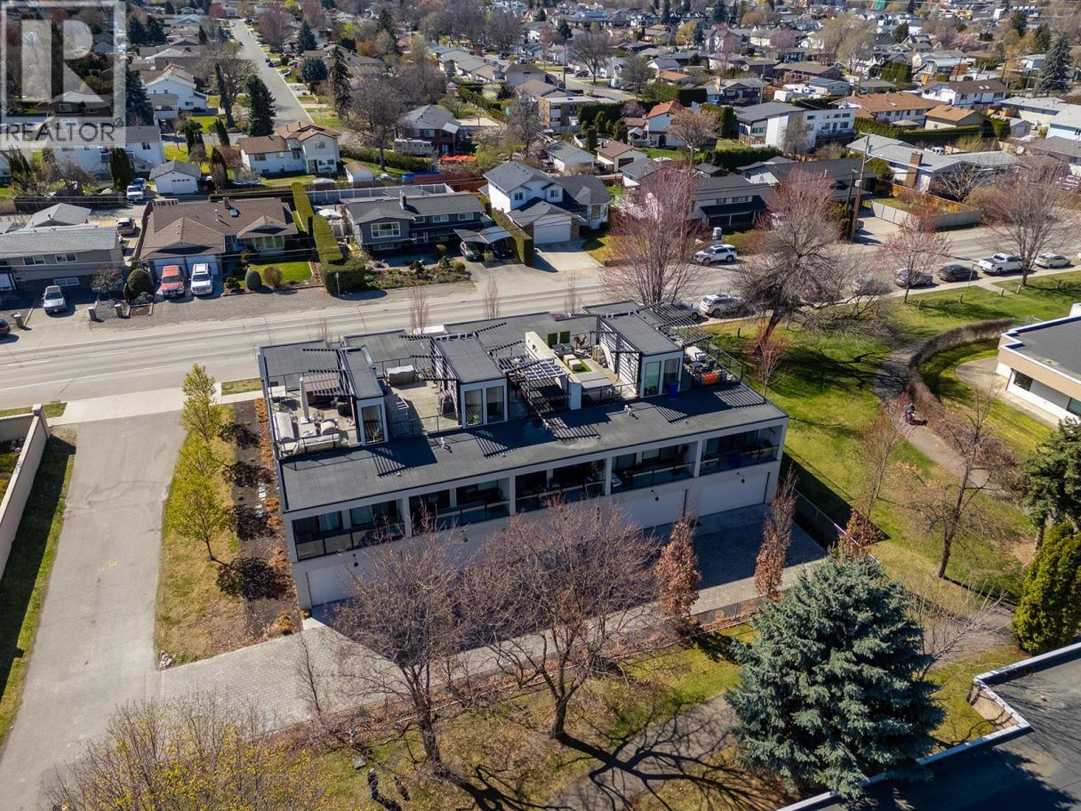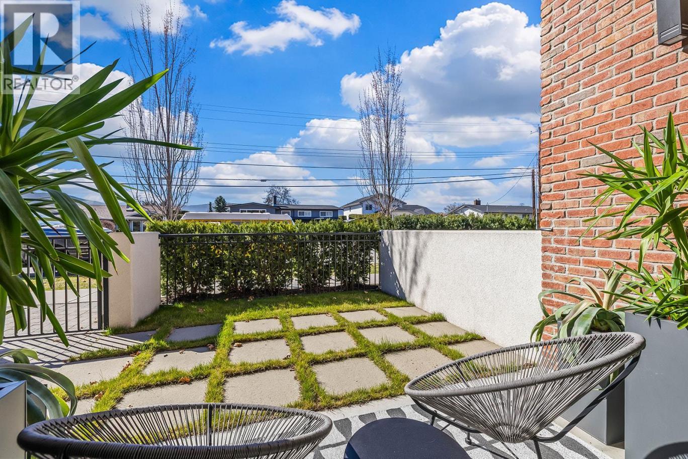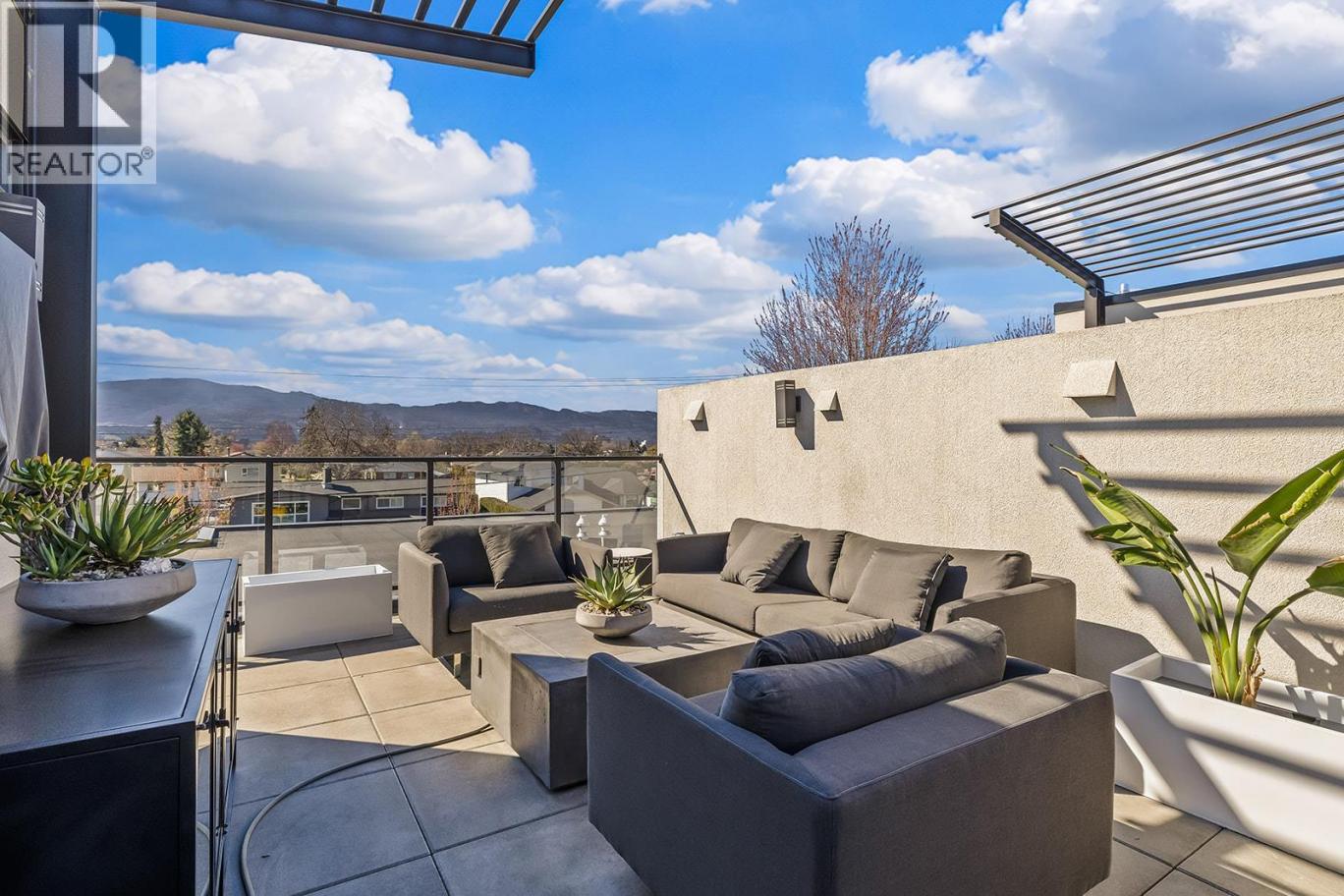 Welcome to this contemporary, modern townhome offering an exceptional lifestyle and is perfectly situated. This property features three bedrooms and three bathrooms with 1914 square feet of bright, open interior living space and an additional 452 square feet of private outdoor space. The main floor boasts a grand level entry and an open-concept layout, ideal for entertaining. The kitchen is fully equipped with stainless steel appliances and features flat-panel cabinets and premium quartz countertops, which are featured throughout the home. The second level is thoughtfully designed for comfort and convenience, housing all three bedrooms, a lounge/family room, and laundry space. The luxurious primary suite includes a walk-in closet and a five-piece ensuite bathroom with a modern glass shower and a soaker tub. The two additional bedrooms are ideal for family or guests and share a full bathroom equipped with a double vanity. They also have their own patio doors leading to a private, quiet covered deck. One of the standout features of this property is the extensive outdoor space: a front patio, a private rooftop patio and covered deck off the spare bedrooms making it perfect for exceptional outdoor entertaining, enjoying Okanagan evenings and mountain views. If you need space for your toys and storage, this home features an attached double garage and an easily accessible crawl space for extra storage. Ideally located, this sought-after neighborhood is perfect for walking or biking to local amenities, including beaches, parks, shopping, transit, and Downtown Kelowna. Pets are allowed with restrictions. (id:6769)