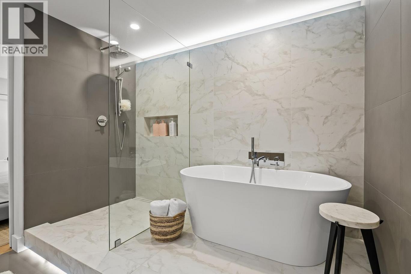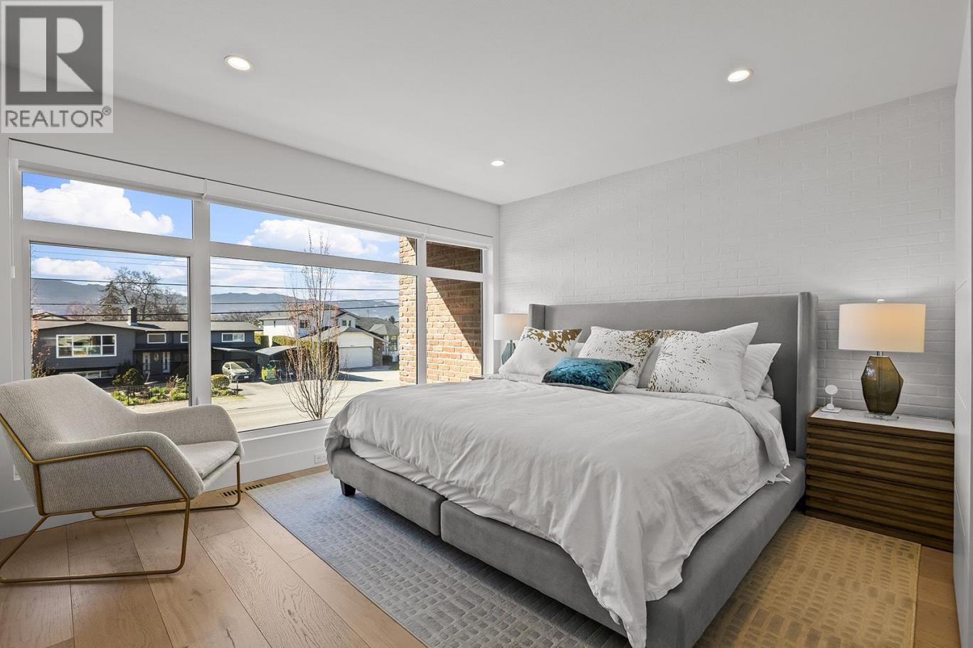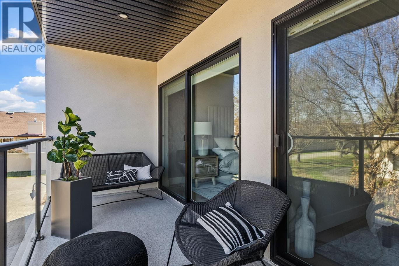 Welcome to this contemporary, modern townhome offering an exceptional lifestyle and is perfectly situated. This property features three bedrooms and three bathrooms with 1914 square feet of bright, open interior living space and an additional 452 square feet of private outdoor space. The main floor boasts a grand level entry and an open-concept layout, ideal for entertaining. The kitchen is fully equipped with stainless steel appliances and features flat-panel cabinets and premium quartz countertops, which are featured throughout the home. The second level is thoughtfully designed for comfort and convenience, housing all three bedrooms, a lounge/family room, and laundry space. The luxurious primary suite includes a walk-in closet and a five-piece ensuite bathroom with a modern glass shower and a soaker tub. The two additional bedrooms are ideal for family or guests and share a full bathroom equipped with a double vanity. They also have their own patio doors leading to a private, quiet covered deck. One of the standout features of this property is the extensive outdoor space: a front patio, a private rooftop patio and covered deck off the spare bedrooms making it perfect for exceptional outdoor entertaining, enjoying Okanagan evenings and mountain views. If you need space for your toys and storage, this home features an attached double garage and an easily accessible crawl space for extra storage. Ideally located, this sought-after neighborhood is perfect for walking or biking to local amenities, including beaches, parks, shopping, transit, and Downtown Kelowna. Pets are allowed with restrictions. (id:6769)