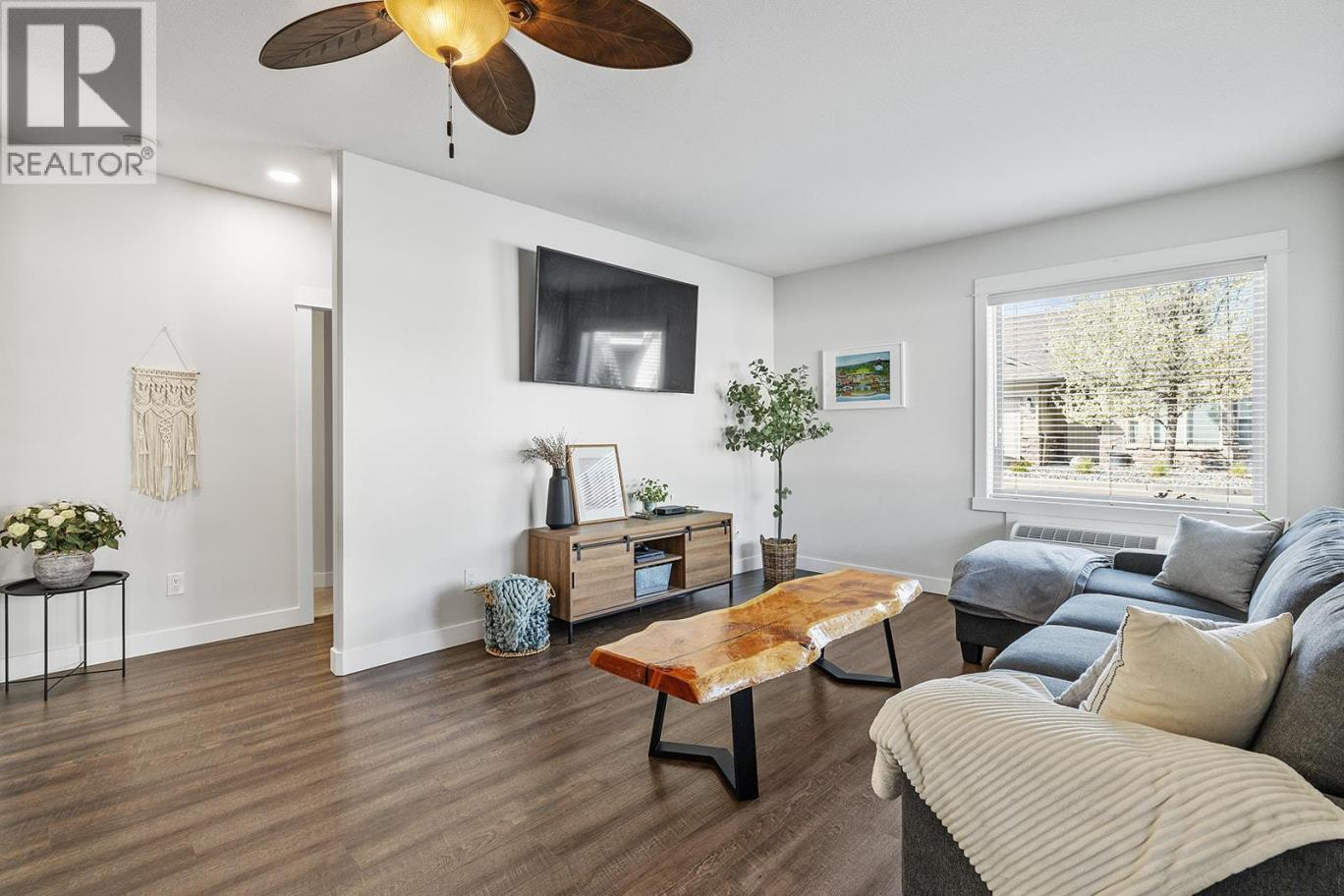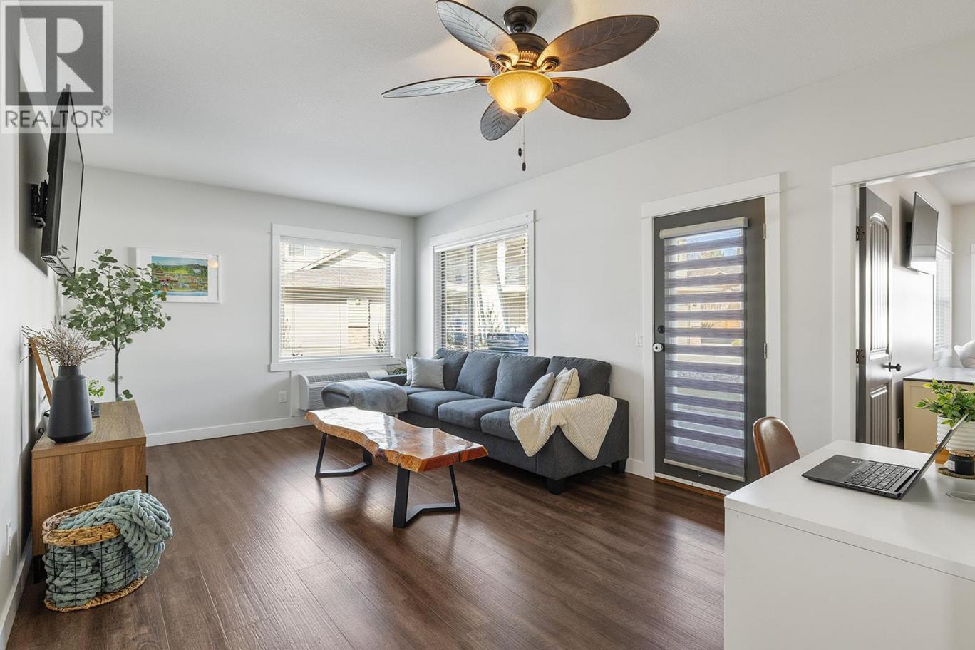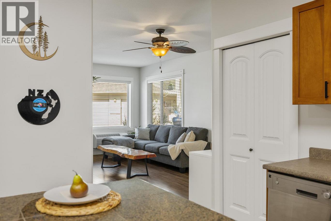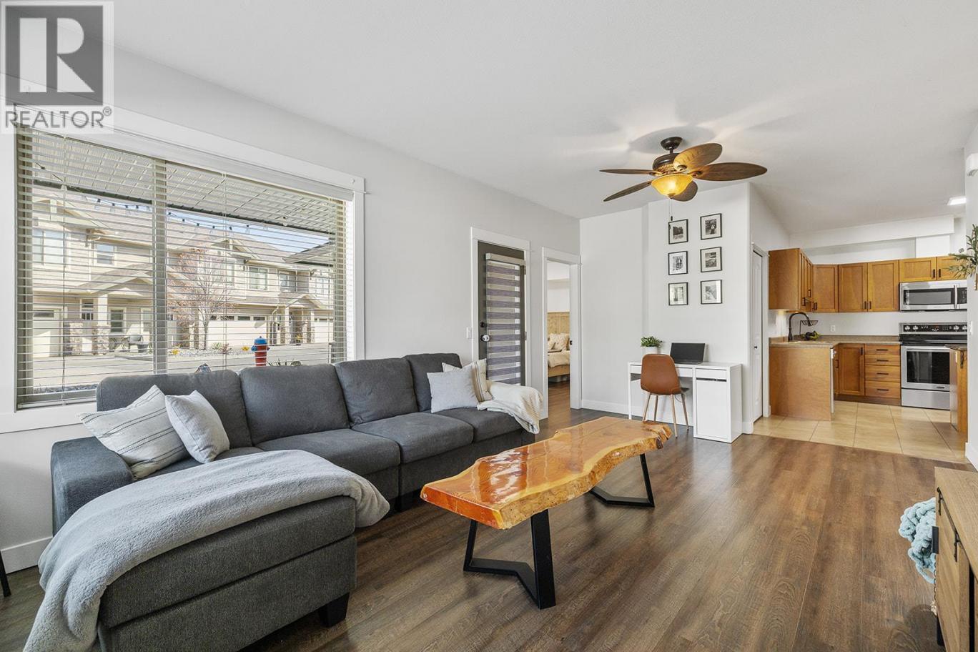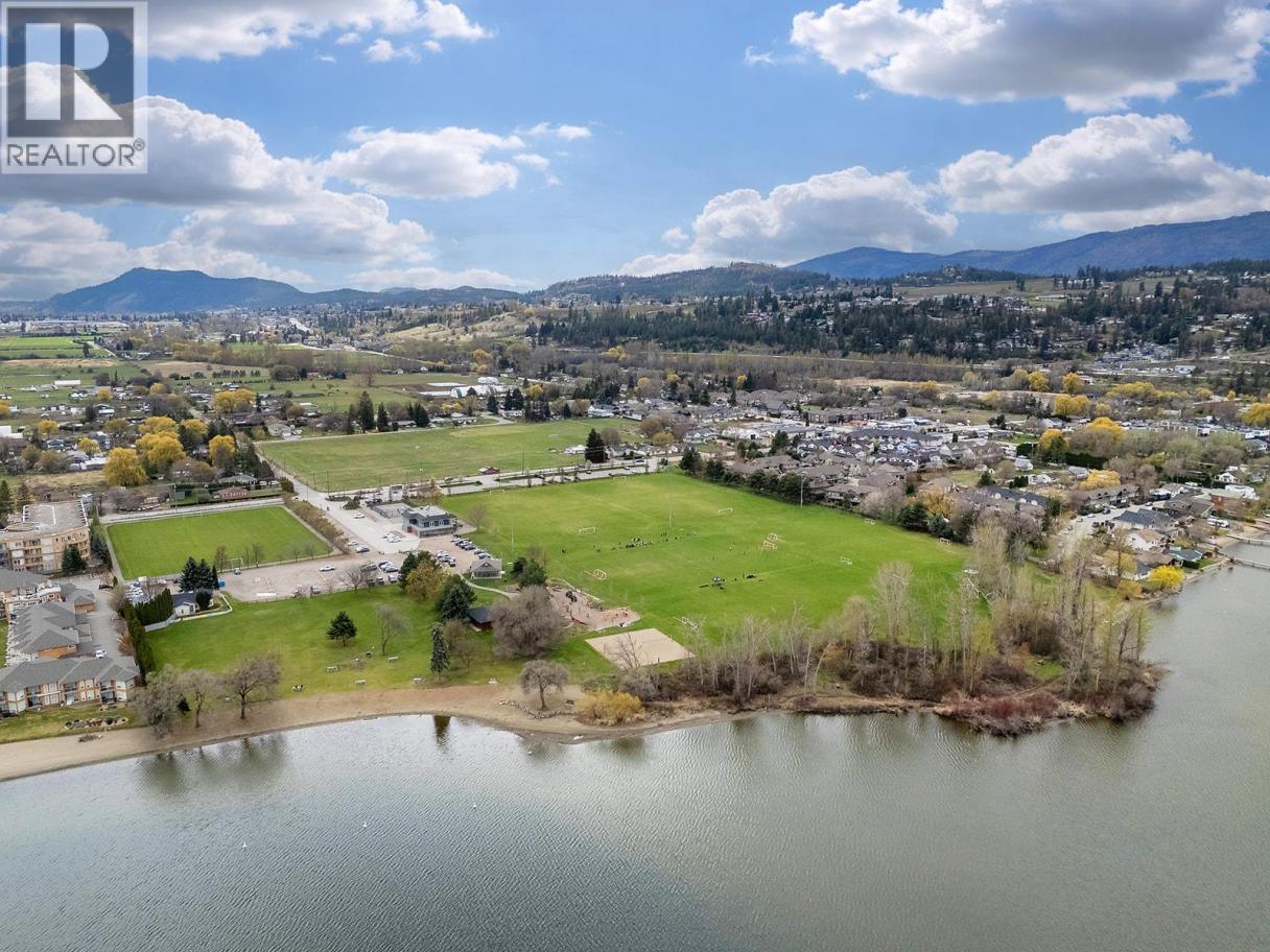 Welcome to this charming ground-floor 2 bed, 2 bath home offering comfort, convenience, and exceptional value. Immaculately maintained and freshly painted throughout, this unit is move-in ready and thoughtfully designed. The bright kitchen features updated stainless steel appliances, an eat-up island, and direct access to the attached single-car garage—perfect for everyday ease. A private front entry also leads directly into the kitchen for added functionality. The spacious living room opens onto a covered concrete patio and grassy area, creating a seamless indoor-outdoor living experience. The well-designed split-bedroom layout ensures privacy, with a generously sized primary bedroom featuring a 3-piece ensuite and walk-in shower. The second bedroom is bright and inviting, with convenient access to a full 4-piece bathroom. Thoughtful upgrades include newer lighting with dimmable features, a newer hot water tank, and two new P-TAC systems for efficient heating and cooling. Plus, low strata fees keep ownership affordable. Pet lovers will appreciate the rare allowance of 2 dogs or cats with no size restrictions. The attached garage provides parking for one car w/ storage with convenient access to first-come, first-serve parking for residents & visitors just outside. Steps to The Rail Trail, Beasley Park & beach—enjoy lake days, trails & easy Lake Country living right at your doorstep. A fantastic opportunity for first-time buyers, downsizers, or investors alike! (id:6769)