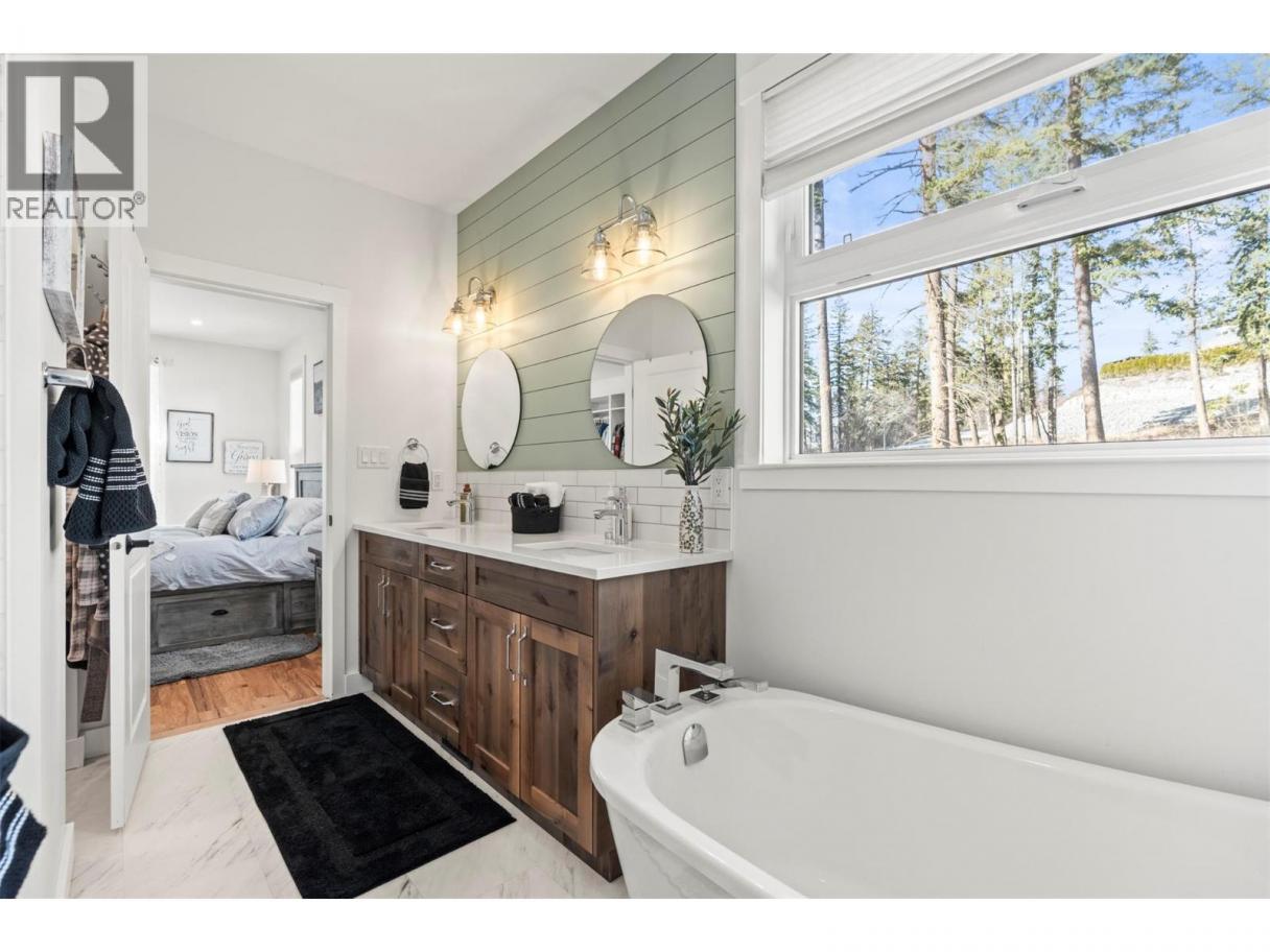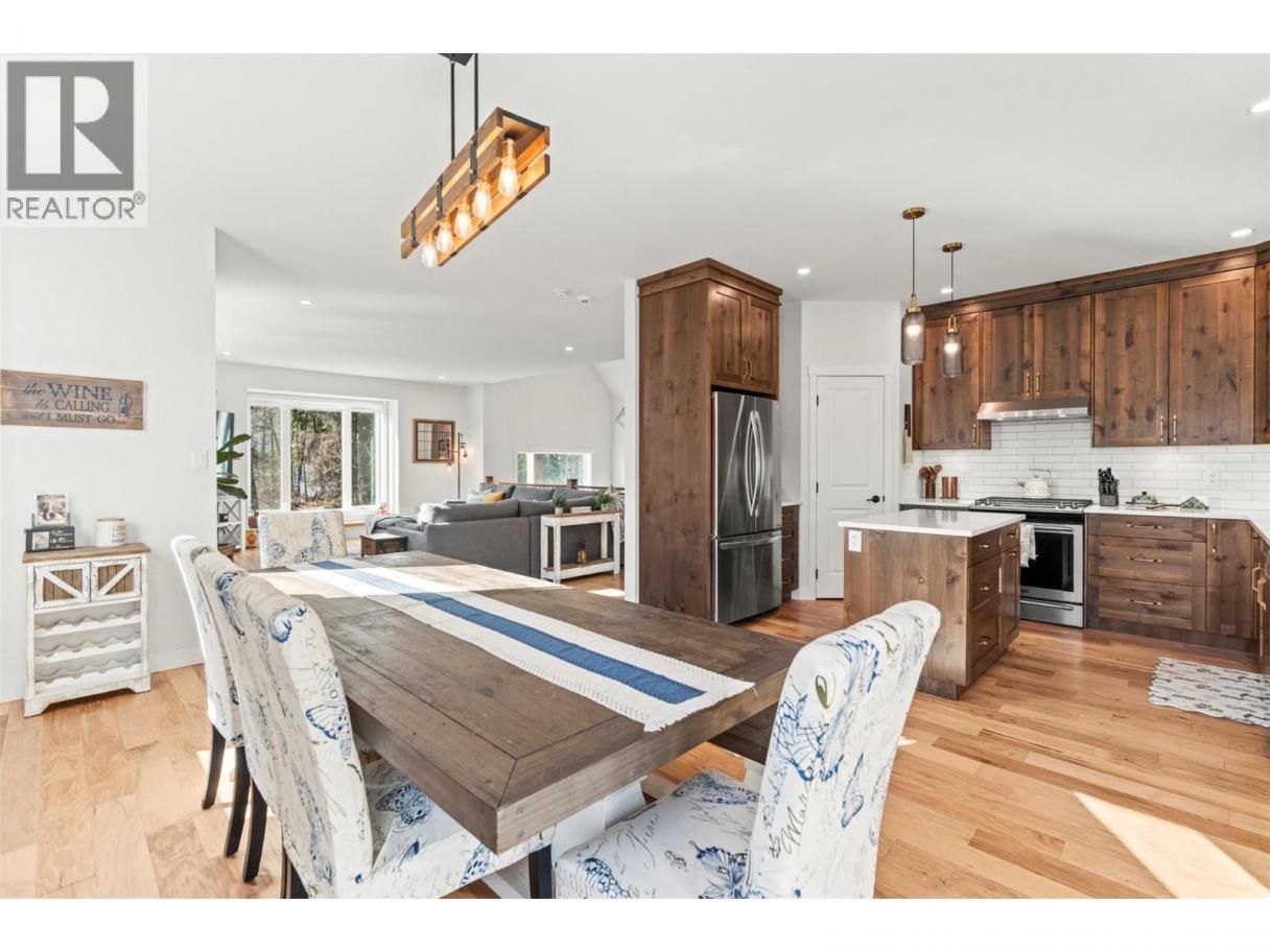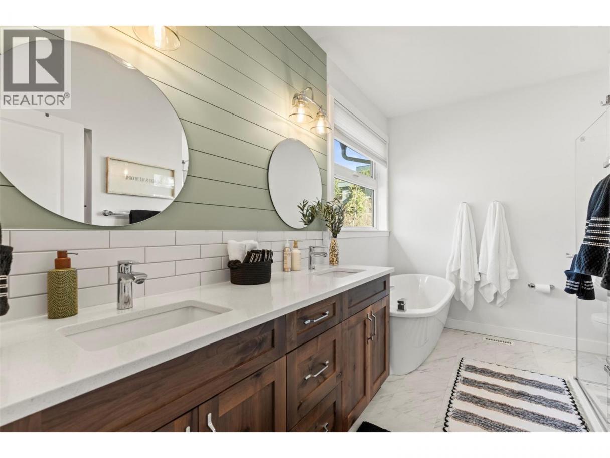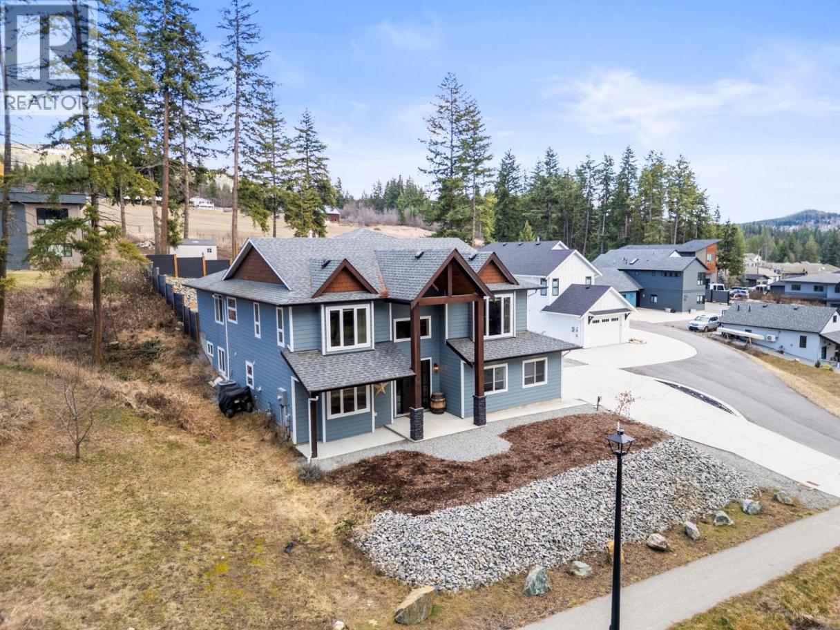 Imagine coming home to space, comfort, and lifestyle in one of Salmon Arm’s most sought-after neighbourhoods. This stunning custom-designed 0.60-acre home sits among elegant estate properties, just minutes from the sparkling waters of Shuswap Lake. Inside, warm Hickory hardwood floors, 9-foot ceilings, and abundant natural light create an open, inviting atmosphere. The kitchen, featuring Alder cabinetry, quartz countertops, and thoughtful design, flows seamlessly into dining and living areas—perfect for entertaining friends, gathering with family, or enjoying a quiet evening. Step outside to the covered upper deck and take in the peaceful surroundings, watch the sunset, or savor your morning coffee. The primary suite is a private retreat with a walk-in closet and luxurious five-piece ensuite, complete with freestanding soaker tub and glass shower. Two additional bedrooms, a full bathroom, and laundry complete the upper level. Downstairs offers flexibility with a fourth bedroom or office with its own bathroom, plus a bright two-bedroom suite with separate laundry and covered patio—ideal for guests, extended family, or rental income. Over $50,000 has been invested in landscaping and fencing, creating a private backyard ready for kids, pets, summer gatherings, or simply relaxing outdoors. With zoning allowing a future carriage home, this property offers not just a home, but a rare opportunity to embrace the lifestyle you’ve been dreaming of—right here in beautiful Salmon Arm. (id:6769)